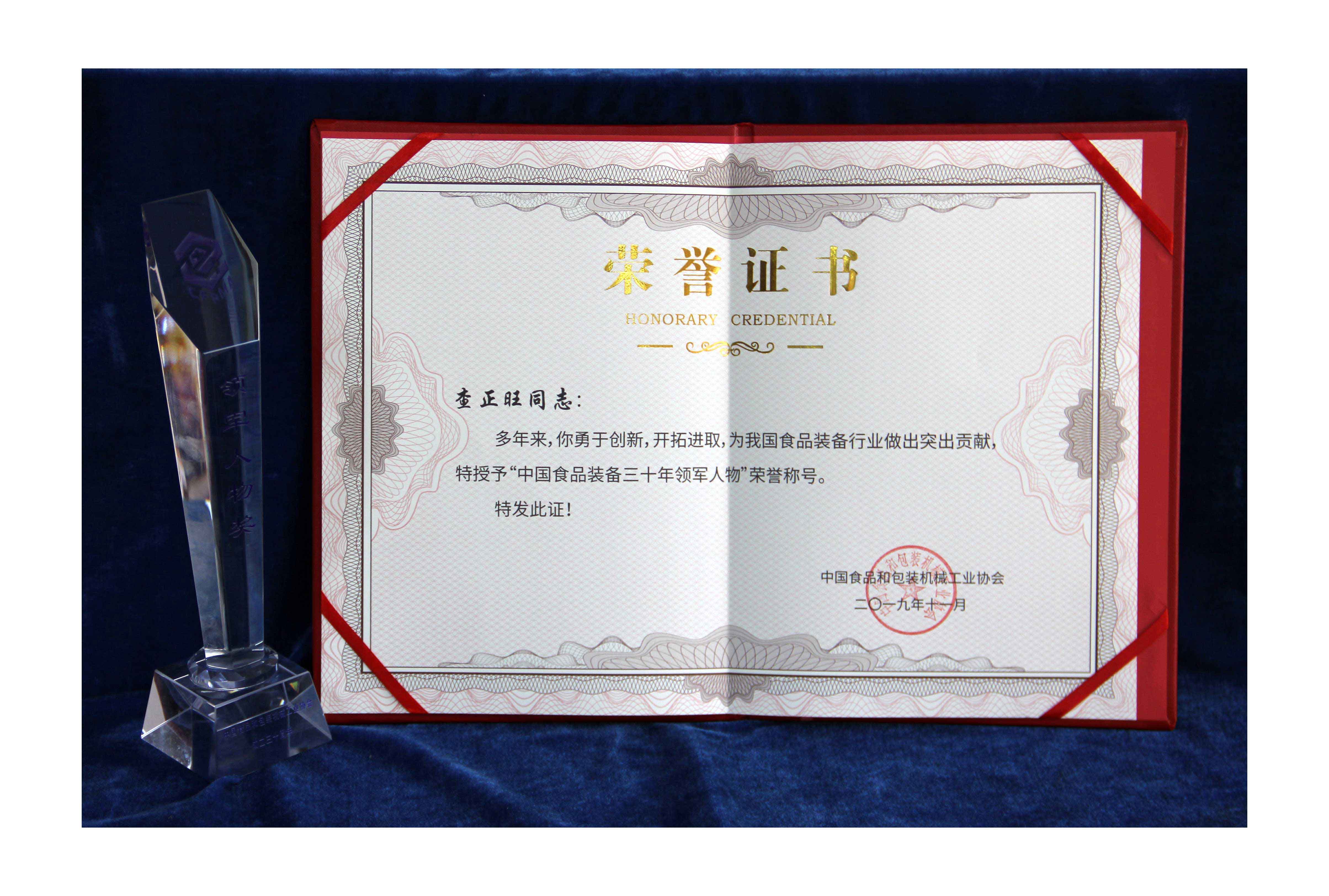 中國食品和包裝工業協會授予合肥中辰輕機董事長查正旺“中國食品裝備30年領軍人物”榮譽稱號,以表彰其多年來勇于創新,開拓進取,為我國食品裝備行業做出的突出貢獻。