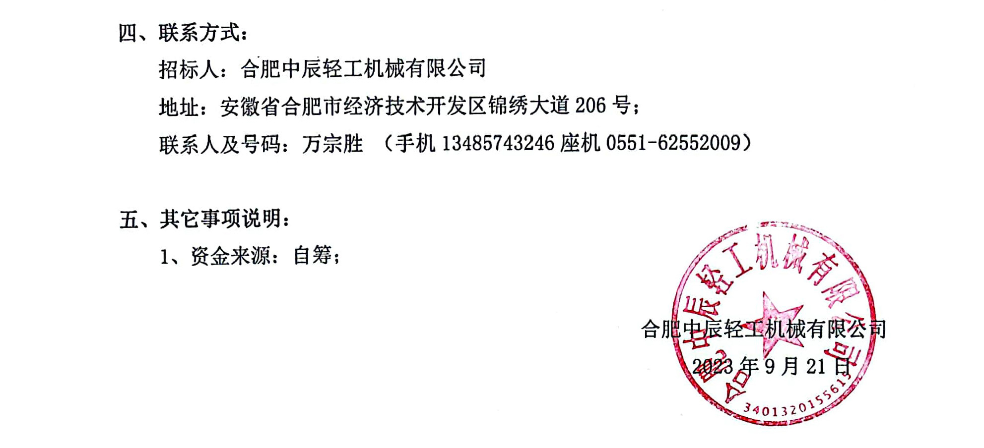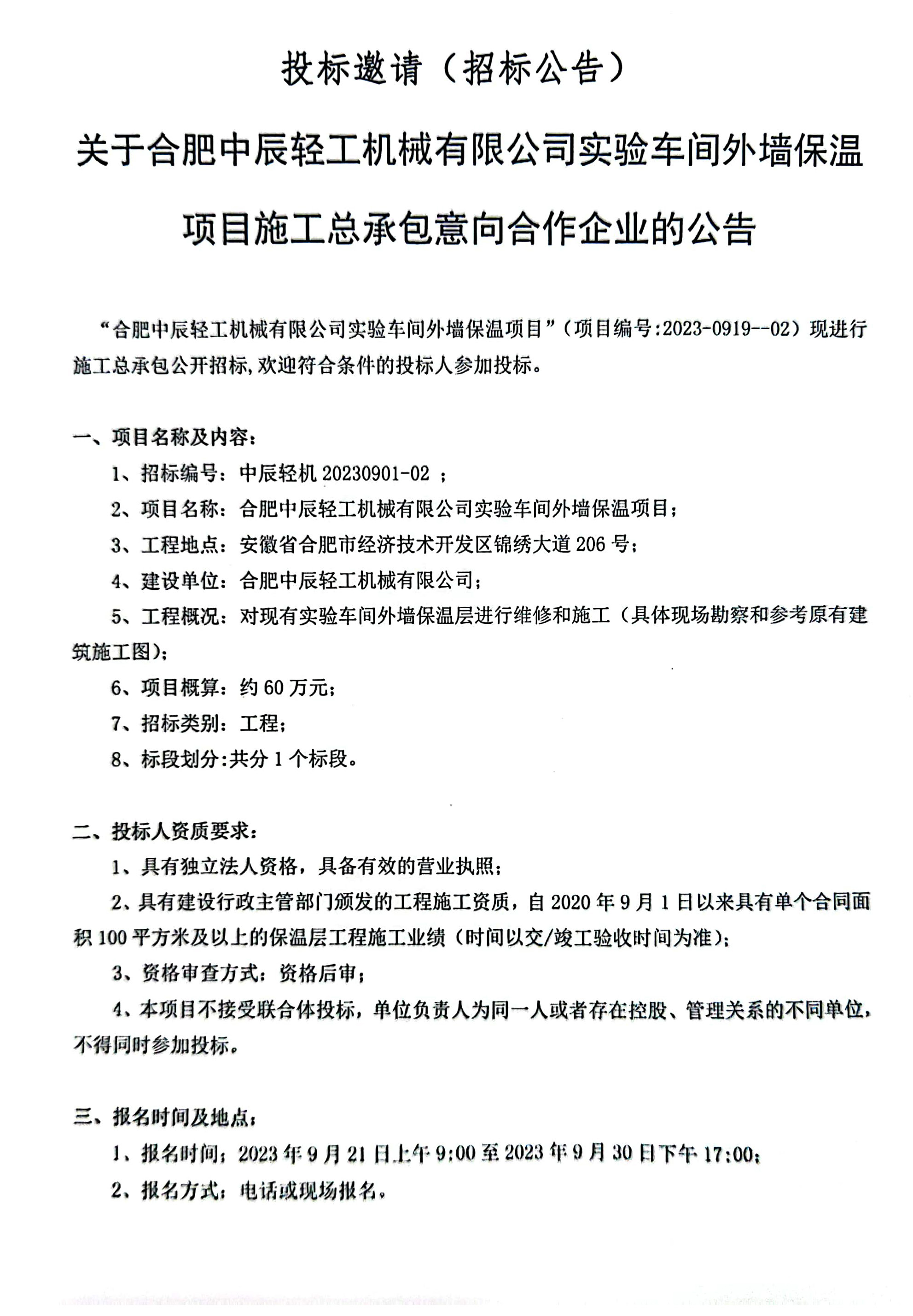 Notice of Invitation for Intended Collaboration with the Construction General Contractor for the Exterior Wall Insulation Project of the Experimental Workshop of Hefei Zhongchen Light Industry Machinery Co., Ltd.