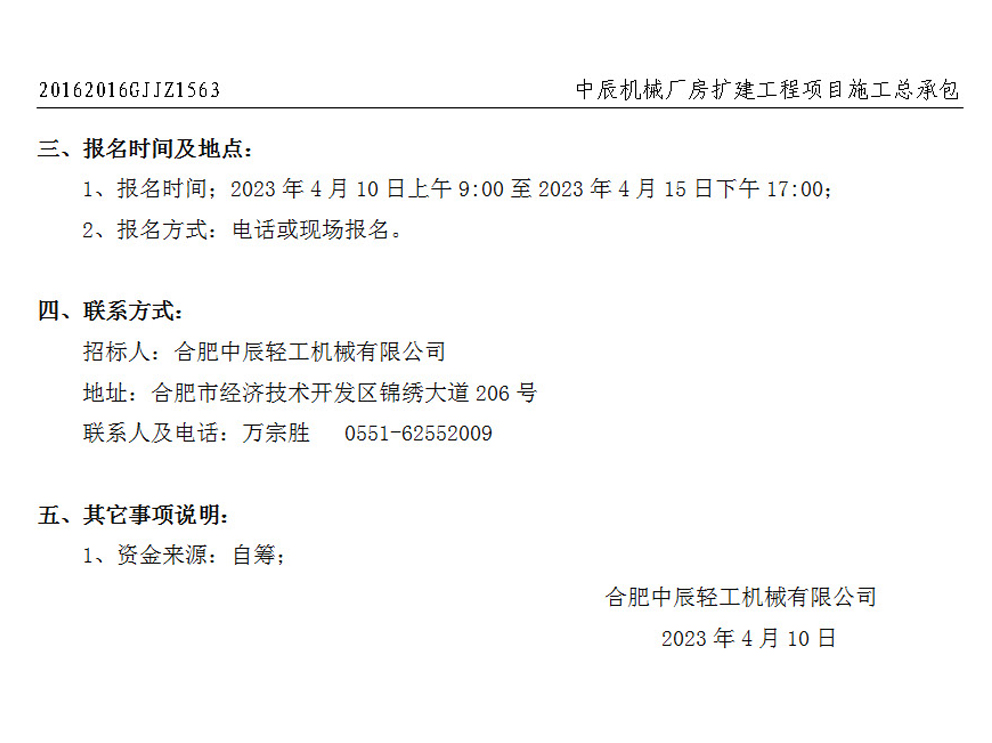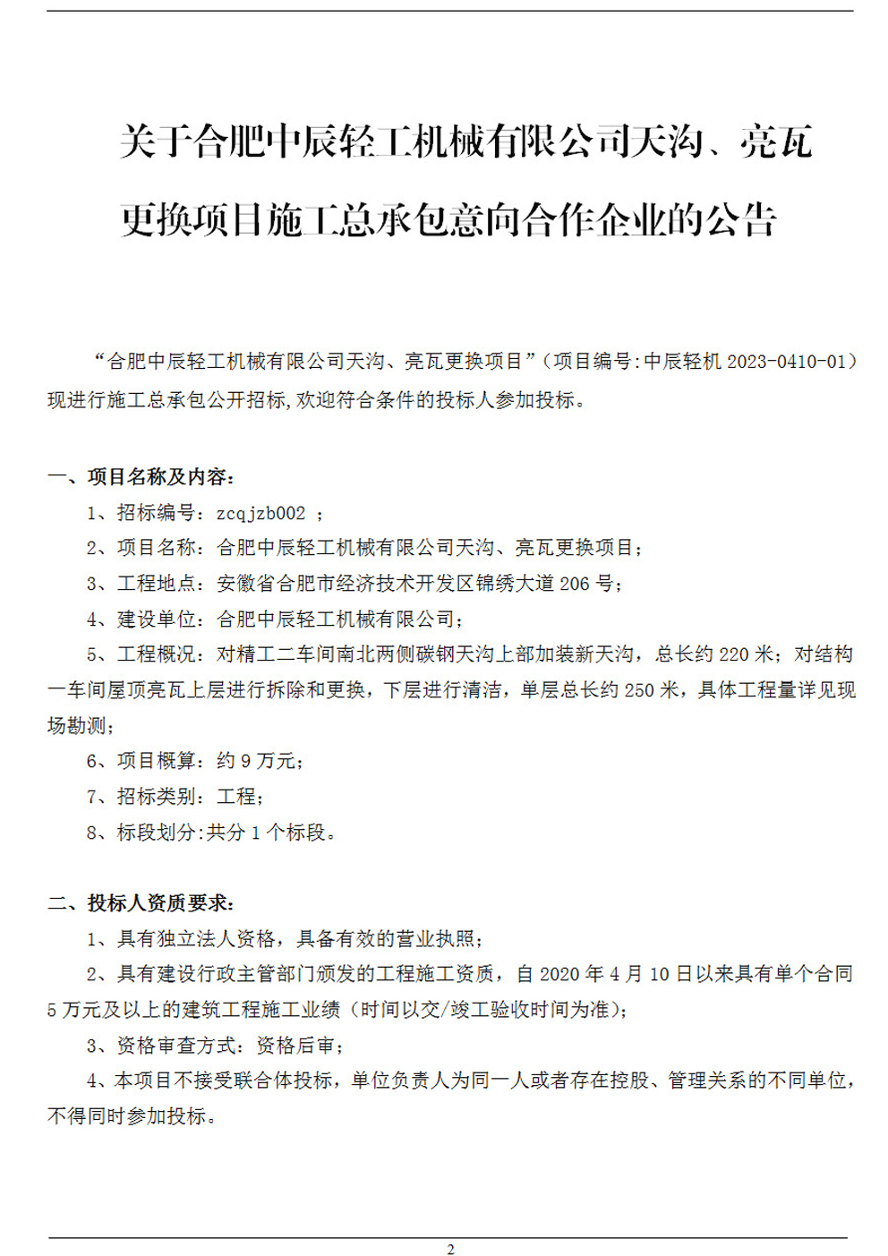 Notice of Invitation for Intended Partnership for the Construction of Gutters and Bright Tiles Replacement Project at Hefei Zhongchen Light Industry Machinery Co., Ltd.